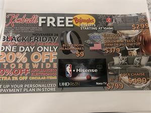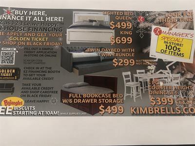 STARTING FRIDAY NOVEMBER 29TH AT 9AM KIMBRELLS FURNITURE WILL BEGIN OUR BLACK FRIDAY SALE !! SO PLEASE JOIN US IN SAVING EVERYONE MONEY AND TIME THAT CAN BE USED ON LOVED ONES!!! E-Z IN HOUSE FINANCING , YOU COULD QUALIFY FOR NO MONEY DOWN AND NO INTEREST !